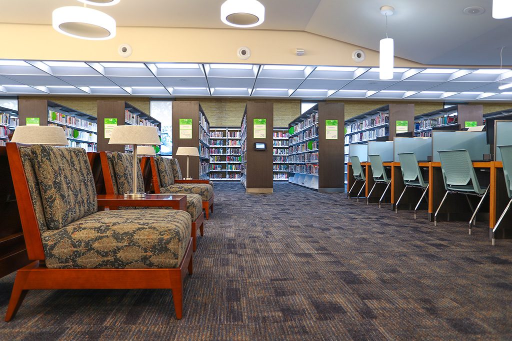 Near the reference desk, warm lighting, and easy seating for relaxed discussions.